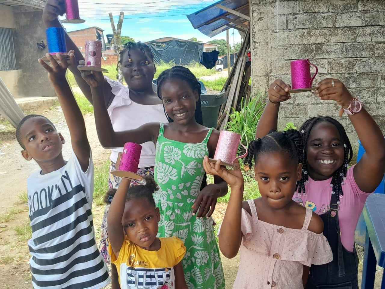 Compra de material didáctico para 200 niños de la selva del Chocó y para los profesores locales. Reparto de materiales para los niños del asentamiento de Ciudad Bolivar en las afueras de Bogotá y 8 packs para los profesores con lecciones para un año. Meriendas para los niños en dos actividades.